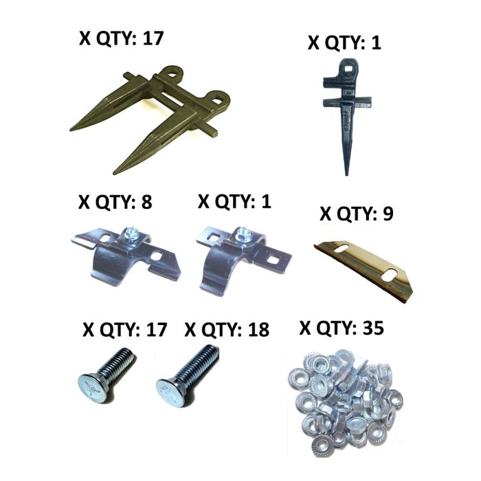 Allis Chalmers 7, 80 Series, Kosch Pitman, and New Idea Pitman #10-41, #250-255 Cutterbar Refill Kit 9'Kit includes:8 - Adjustable Hold down clips, replacement for OEM# 70804074, 290816, 0145HS - 457-065 1 - High Adjustable Hold down clip, replacement for OEM# 70804075 - 457-051 9 - Wearplates, replacement for OEM# 71116532, 290815 - 457-00117.5 - Guards - G-218DH18 - 7/16 x 1 3/4" Plow Bolts - 458-22717 - 7/16 x 1 1/2" Plow Bolts - 458-22635 - 7/16 Flange Nuts - 458-256