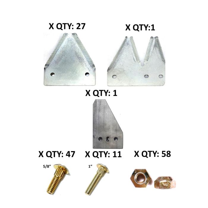 Hesston 1070 top serrated plated 7' Section Refill KitApplications include Hesston 1071, 1085, 1090, 1091 and 1095Contents of Kit 27-HTSPL Sections 206-0241-RH DBL End Section 207-3101- LH ½ Section 207-08558- Nut cone lock 458-00747 - 5/8" Bolts 458-00111 - 1" Bolts 458-003