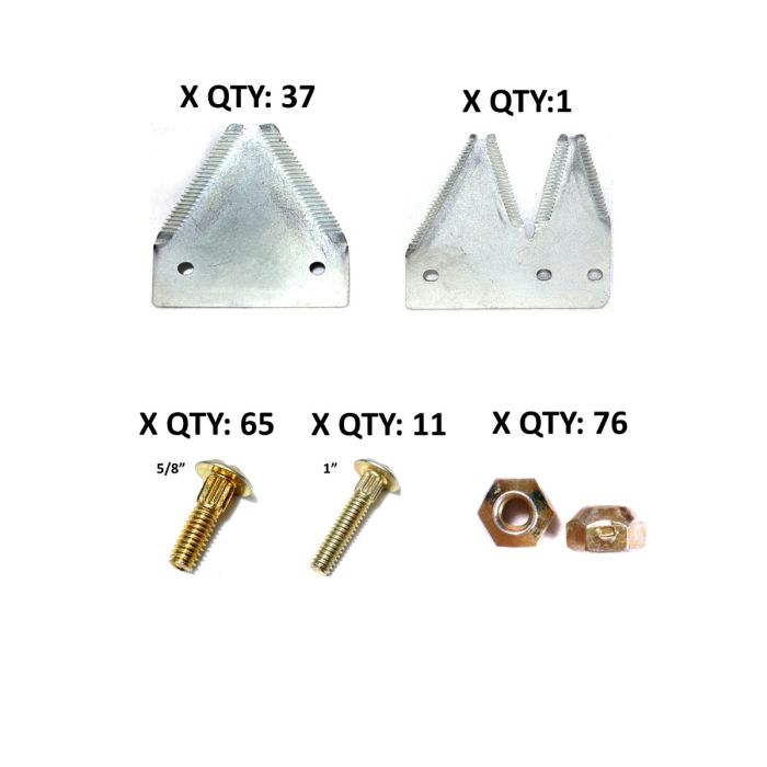 Hesston 600, PT-7, PT-10, PT-12 and New Holland 905 top serrated plated 9' Section Refill KitContents of Kit 37-HTSPL Sections 206-0241-RH DBL End Section 207-313.576- Nut cone lock 458-00711 - 1" Bolts 458-00365 - 5/8" Bolts 458-001