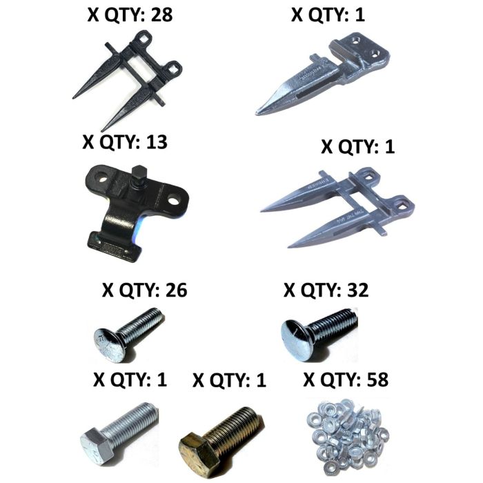 Hesston 6550, 6650, 6566, 6665, 6666, 1014+2 Swing Tongue Complete Cutterbar Rebuild Kit 14'Kit includes:13 - Adjustable hold down clips, replacement for OEM# 700109725 - 457-07028 - Guards - G-215DH1 - Guard - G-4251 - Center Guard - G-430CTR1 - Bolt - 458-275 (not pictured)1 - Bolt - 458-280 (not pictured)26 - 7/16 x 1 3/4 Carriage Bolts - 458-21732 - 7/16 x 1 1/2 Carriage Bolts - 458-21658 - 7/16 Flange nut - 458-256