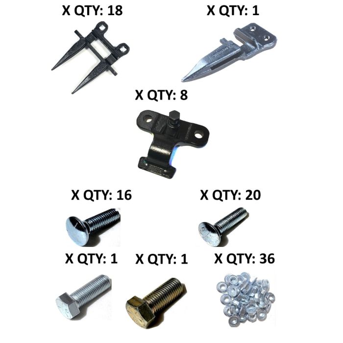 Hesston 8200, 8250, 1160, 1260, 1265 Complete Cutterbar Rebuild Kit 9'Note: Case-IH 8340 same as Hesston 1160Kit includes:8 - Adjustable hold down clips, replacement for OEM# 700109725 - 457-07018 - Guards - G-215DH1 - Guard, replacement for OEM# 49395 - G4251 - Bolt - 458-275 (not pictured)1 - Bolt - 458-280 (not pictured)16 - 7/16 x 1 3/4 Carriage Bolts - 458-21720 - 7/16 x 1 1/2 Carriage Bolts - 458-21636 - 7/16 Flange nut - 458-256