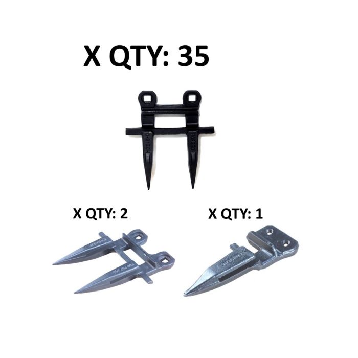 Hesston 8400, 8450, 9230, 9340, 1170, 1270, 1275; and Case-IH 8840, 8870, 8380 18' G-215DH guard kitContents of Kit:1 - G-425 end guard2 - G-430CTR center guards35 - G-215DH guard (Double-hardened, made in USA)Recommended hardware (not included in guard kit): Carriage bolt, 7/16" x 1-1/2", part# 458-216Carriage bolt, 7/16" x 1-3/4", part# 458-217Serrated flange nut, 7/16", part# 458-256