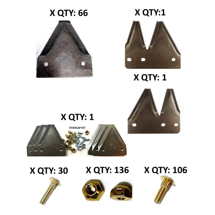 John Deere 1525, 1600, 3830, #300-300A under serrated 16' Section Refill KitContents of Kit 66-XHUS Sections 202-9901- RH Double end section - 207-3101- LH Double End 207-3111- Overlap Kit 207-435136- Nut cone lock 458-00730 - 1" Bolts 458-003106 - 5/8" Bolts 458-003