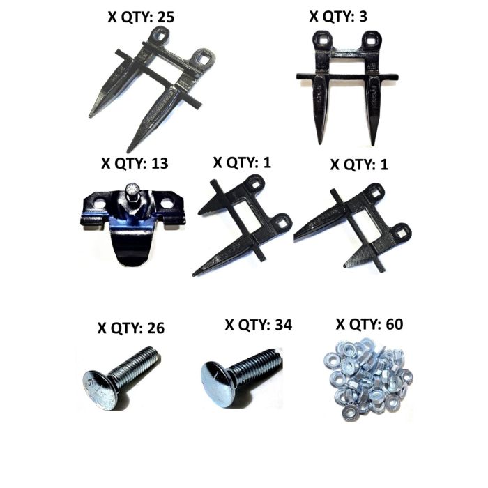 MacDon A30-S Single Drive Complete Cutterbar Rebuild Kit 14'Kit includes:13 - Adjustable hold down clips, replacement for OEM# 118499 - 457-054A25 - Guards, replacement for OEM# 118344 - G-344DH3 - Guards, replacement for OEM# 118345 - G-3451 - Guard, replacement for OEM# 118301 - G-3011 - Guard, replacement for OEM# 118302 - G-30226 - 7/16 x 1 3/4 Carriage bolts - 458-21734 - 7/16 x 1 1/2 Carriage bolts - 458-21660 - 7/16 Flange nuts - 458-256