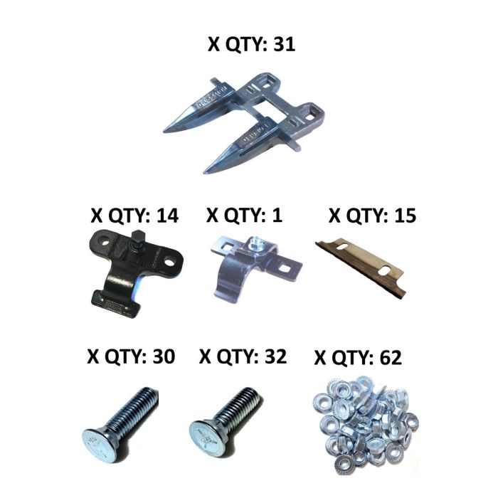 John Deere 1209-Early, 800, 830, 880, 2250, 2270 Complete Cutterbar Rebuild Kit 15'Kit includes:14 - Adjustable hold down clips, replacement for OEM# E47955 - 457-0701 - High Adjustable hold down clip - 457-05115 - Wear plates, replacement for OEM# E47954 - 457-00231 - Guards, replacement for OEM# E62000 - G-22130 - 7/16 x 1 3/4 Plow Bolts - 458-21732 - 7/16 x 1 1/2 Plow Bolts - 458-21662 - 7/16 Flange nut - 458-256